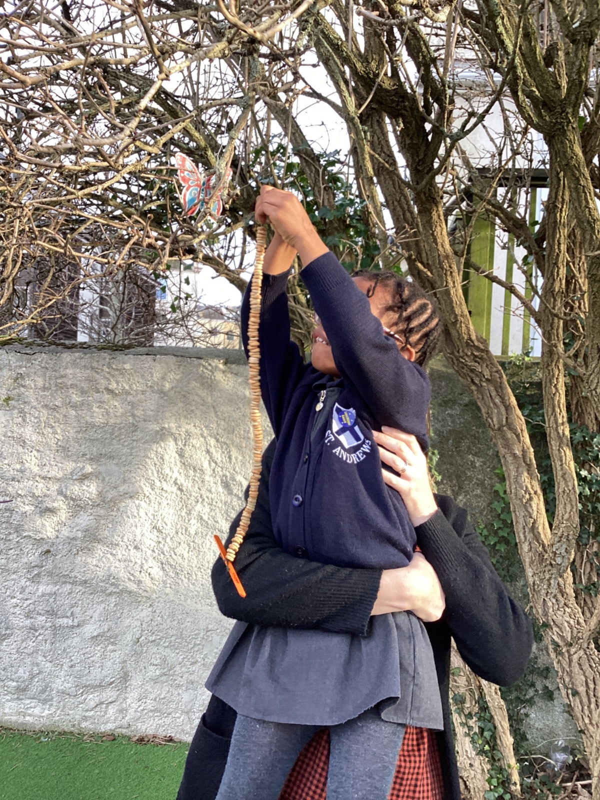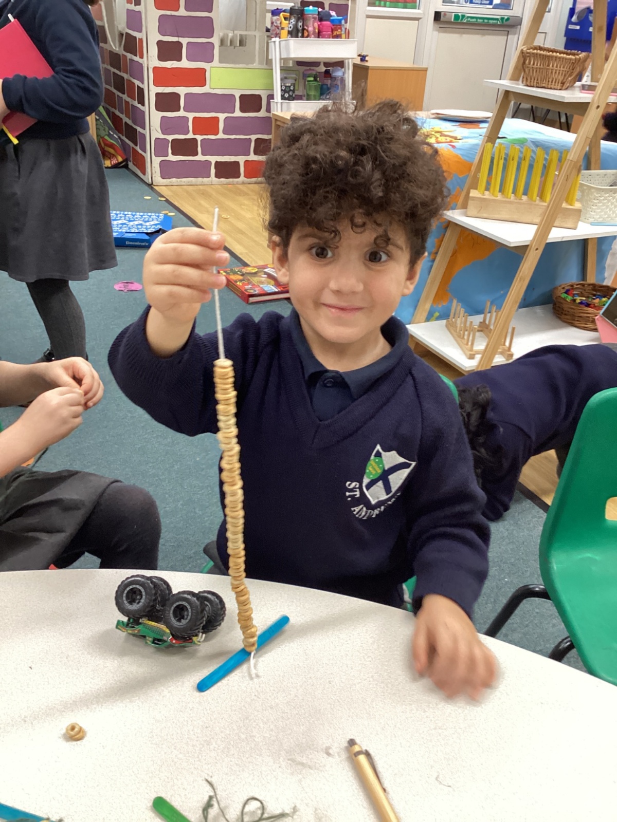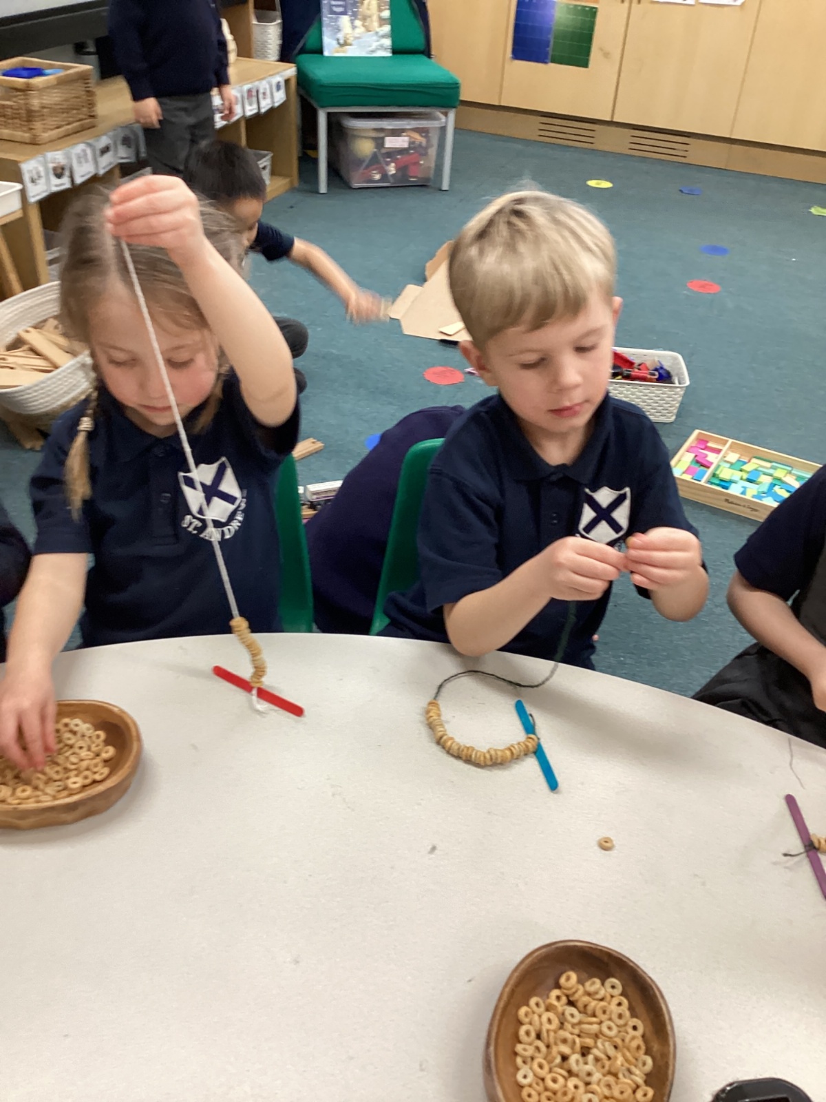 We learnt about hibernation and discovered that some animals sleep through the winter. We then thought about how birds might find it tricky to find food in the winter. So, we made our own bird feeders by threading cheerios onto pieces of string. We then hung our bird feeders from the tree in our playground.