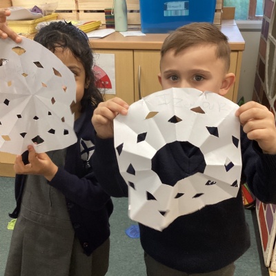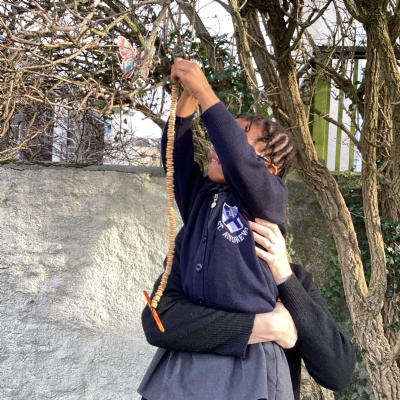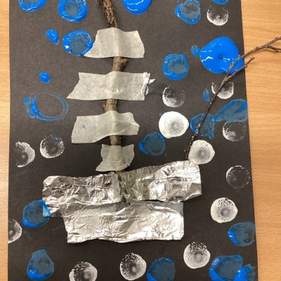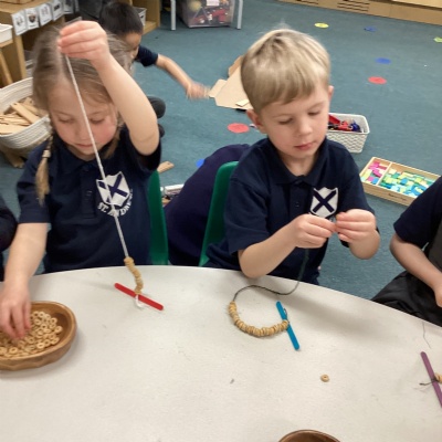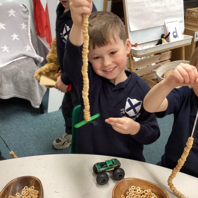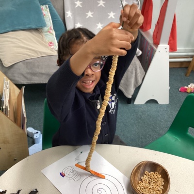 We learnt about hibernation and discovered that some animals sleep through the winter. We then thought about how birds might find it tricky to find food in the winter. So, we made our own bird feeders by threading cheerios onto pieces of string. We then hung our bird feeders from the tree in our playground.